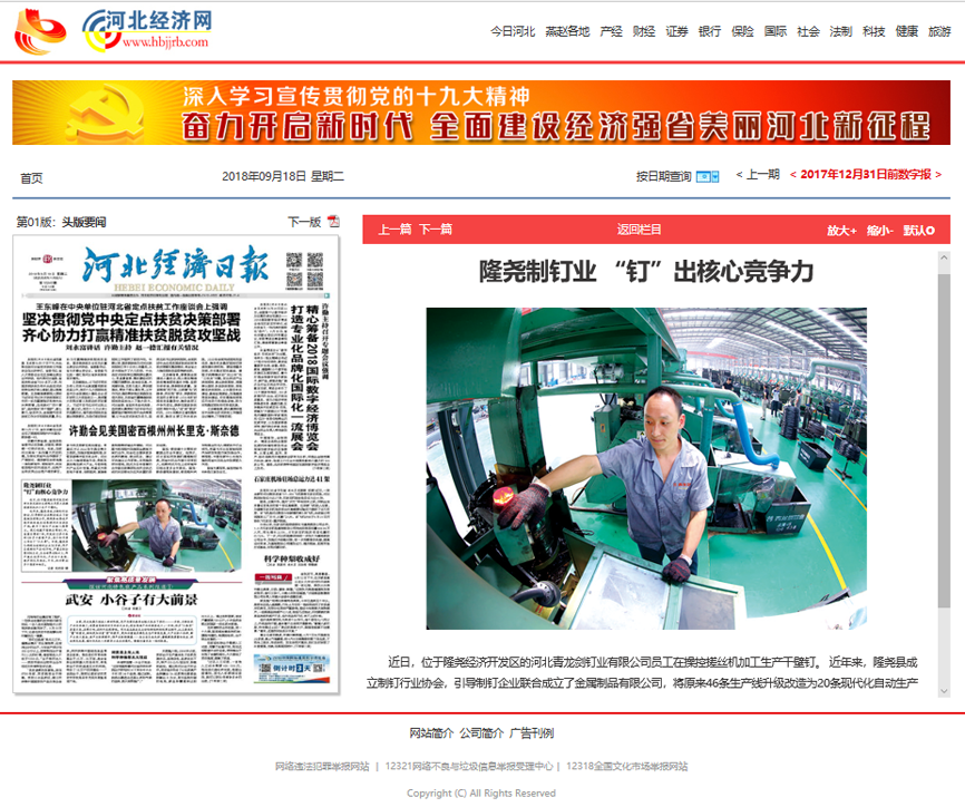 點贊!青龍劍釘業(yè)被《河北經(jīng)濟日報》頭版要聞