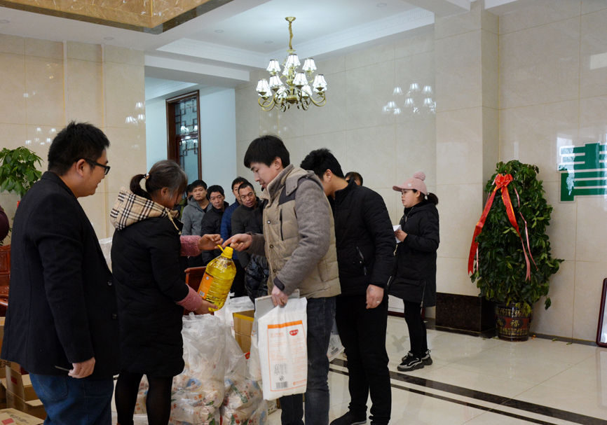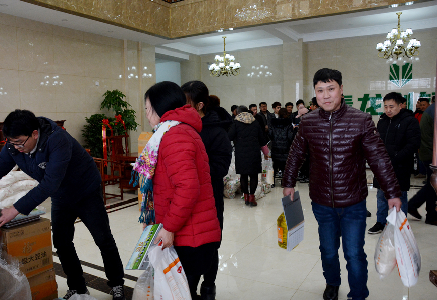 員工會(huì)議結(jié)束后,員工們領(lǐng)取公司為大家準(zhǔn)備的福利。