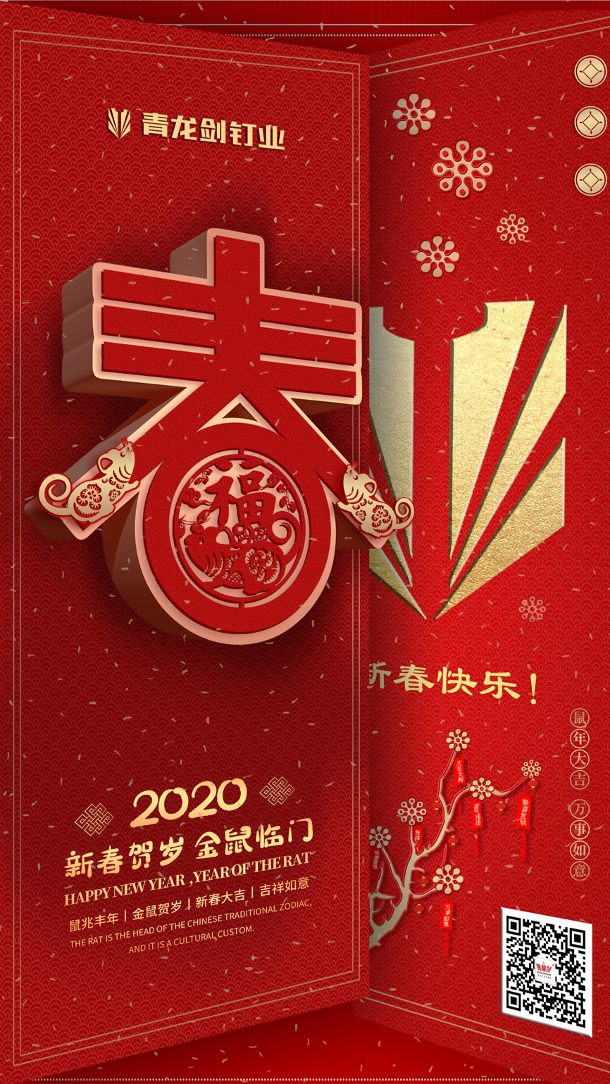 歲序常易,華章日新。當(dāng)時(shí)光穿越年輪,邁向2020新春佳節(jié),中華大地因納其盛世靈氣而芳澤毓秀,在這個充滿激情與期望的時(shí)刻,青龍劍釘業(yè)全體人員向所有關(guān)心關(guān)愛青龍劍公司發(fā)展的社會各界同仁、全國的經(jīng)銷商和用戶朋友們致以親切的節(jié)日問候和誠摯的新春祝福!